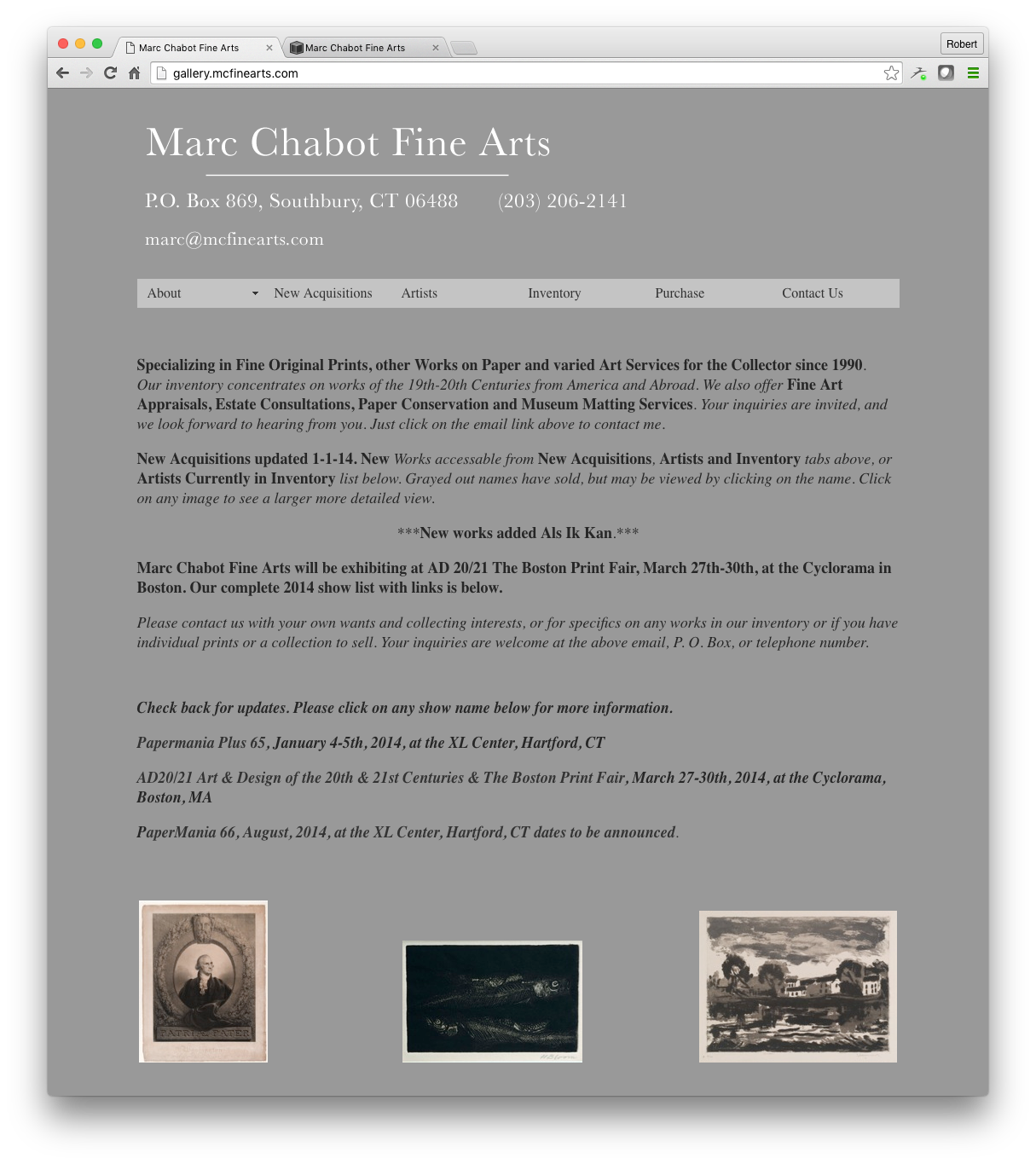 As the new tagline states, Marc Chabot Fine Arts sells "Fine Original Prints And Works On Paper From America And Abroad" Although well-known and well-respected, the company risked going under due to slowing in-person sales as increasing numbers of art buyers transitioned towards internet searches find art works and assess market values.