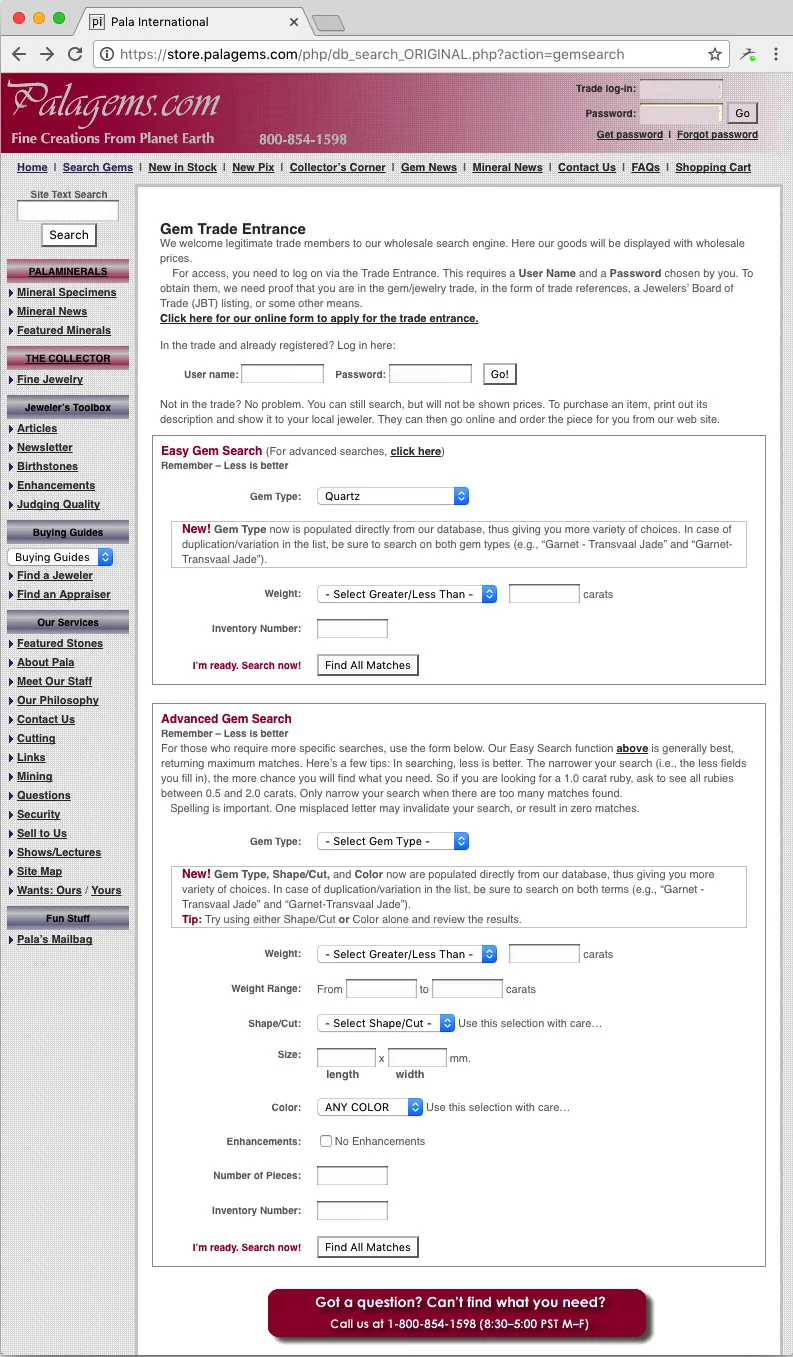 Months prior to the start of this project, Pala purchased a lifetime license for a proprietary, online system that powered thousands of art gallery ecommerce websites. When the sale was made, the web firm and Pala must have thought that the system could be easily modified for Pala's gemstone and mineral specimen businesses. There was, however, a misunderstanding of expectations. Pala thought they'd bought three new websites for the price of one. The web firm thought that they'd sold an online database engine plus a limited number of hours to modify that engine.