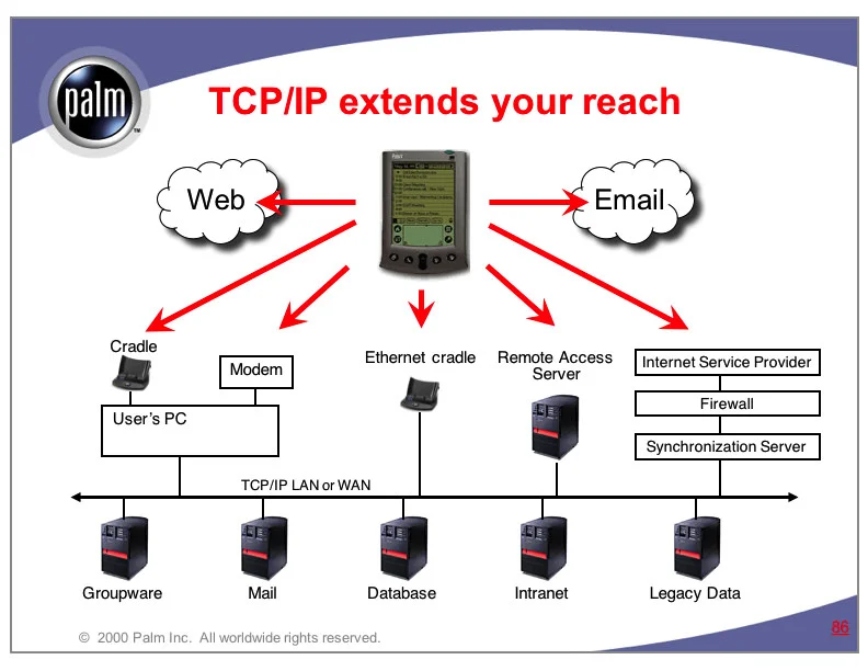 The very first Palm handhelds were IP devices, capable of navigating the internet. However, the implications of this were not broadly understood, even at Palm. After months of conversations with sales engineers, product managers, and Palm OS programmers, I developed this diagram.