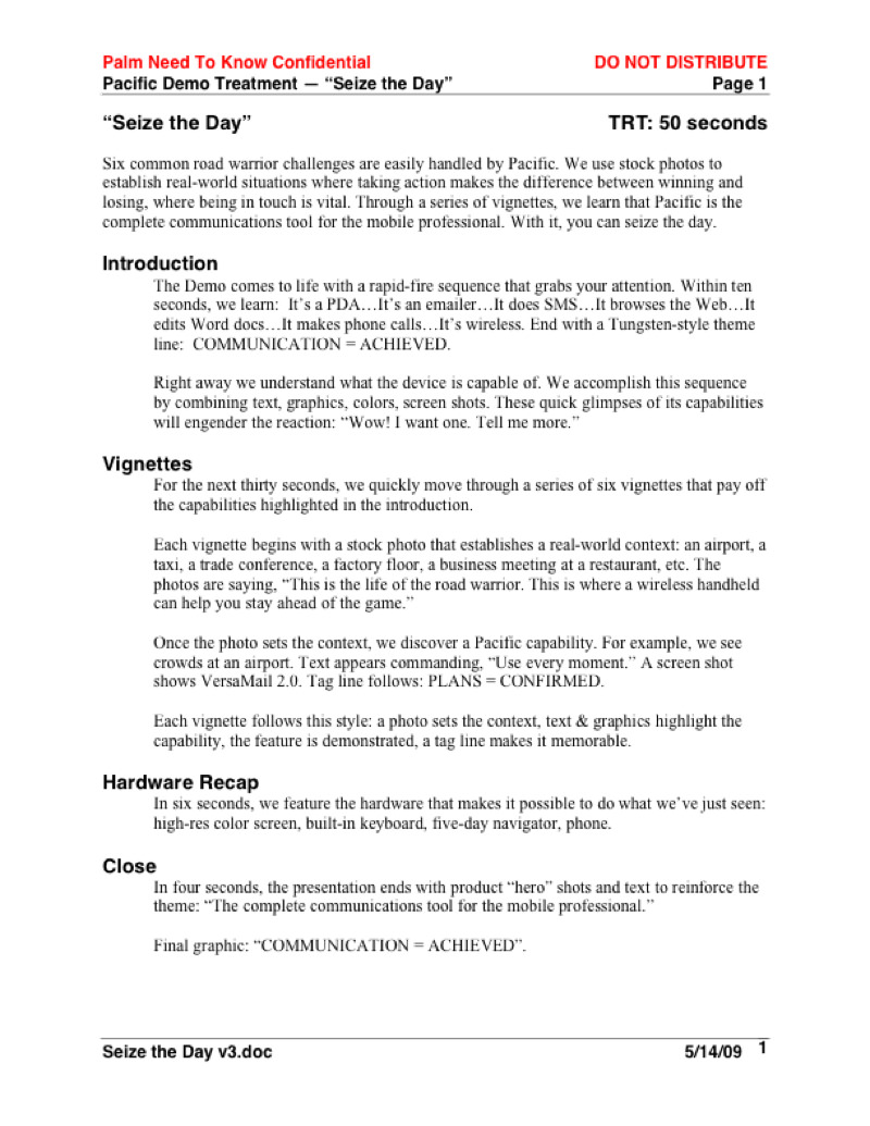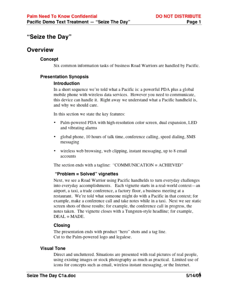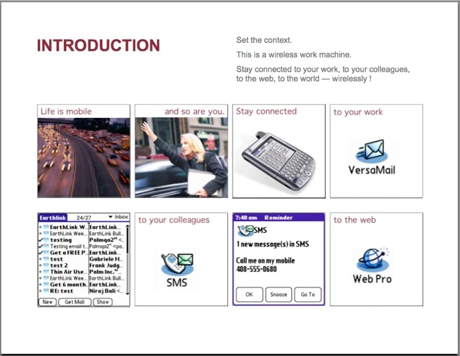 I used a cinematic approach to development. First I wrote three one-page text treatments that characterized the animation; then a script; then a storyboard. Each phase was approved by marketing and sales. The final storyboard was also approved by Palm Legal.